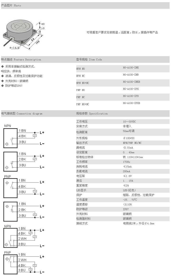 饼型接近传感器 HG-A100-ZNK,HG-A100-ZNB,HG-A100-ZNKB,HG-A100-ZPK,HG-A100-ZPB,HG-A100-ZPKB,