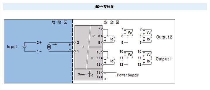 将处于现场危险区域的各种设备的直流信号(420mA05V,经过安全栅隔离、抗干扰抑制等处理后。向安全侧的控制系统或其它智能仪表输出2路直流电流或 电压信号。