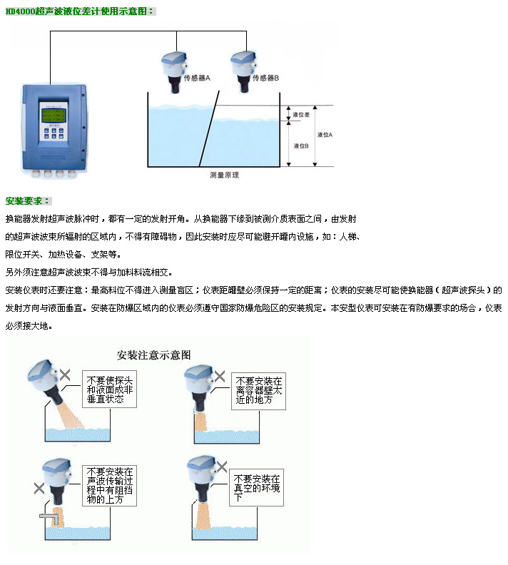 概述: HD4000超声波液位差计由2个超声波探头和1台主机两部分组成,是一种先进的非接触式物位测量仪器,超声波探头直接安装在被测介质的上方。本仪表具有自动功率调整,增益控制,温度补偿,对干扰回波有抑止功能,有效提高测量结果的精确性;大屏背光LCD显示,全中文菜单,可同时显示高液位、低液位、液位差值;可输出4~20MA模拟信号、可编程控制器、RS485口。