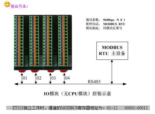 ZT321自带一个RS485通讯口,内部封装了MODBUS协议,可以独立工作,MODBUS从站地址等于从左向右排列的位置号。
