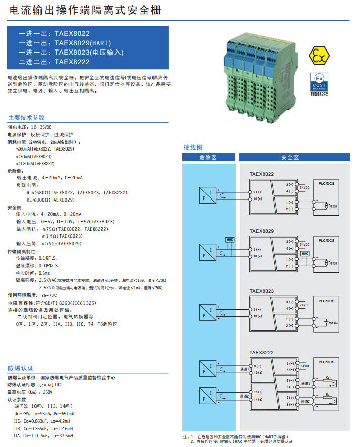 TAEX8022,TAEX8029,TAEX8023,TAEX8222,电流输出操作端隔离式安全栅
