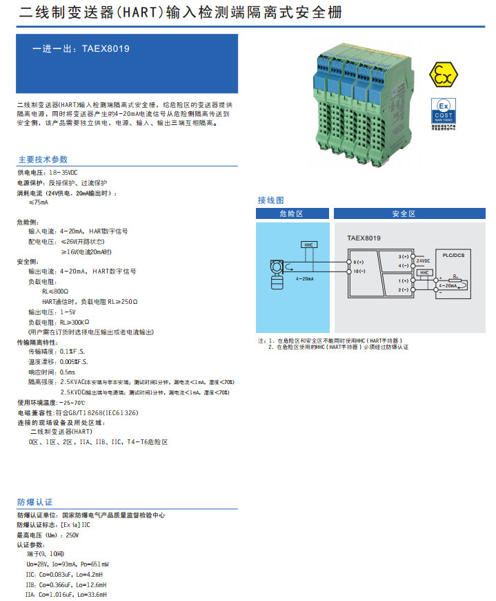 TAEX8019,二线制变送器输入检测端隔离式安全栅