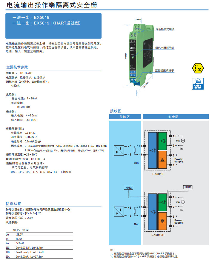 EX5019,EX5019H,电流输出操作端隔离式安全栅