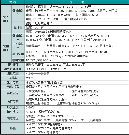 本表所列为最大量程,用户可在量程范围内通过修改仪表二级参数确定量程范围