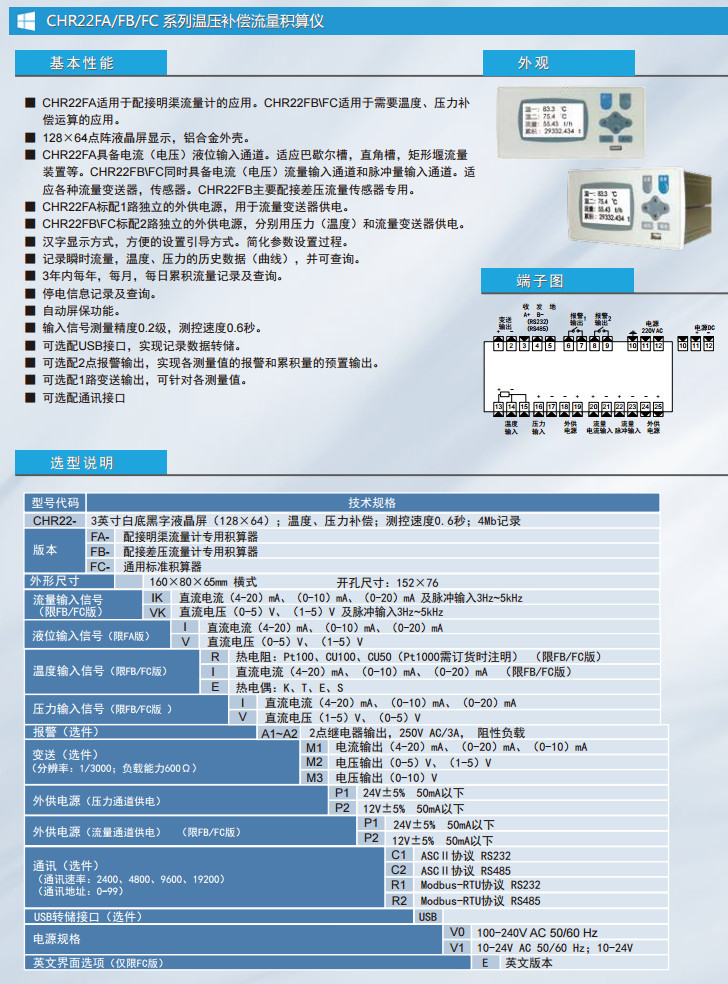 CHR22FB,CHR22FC,CHR22FA,明渠流量积算器(液晶中文显示)
