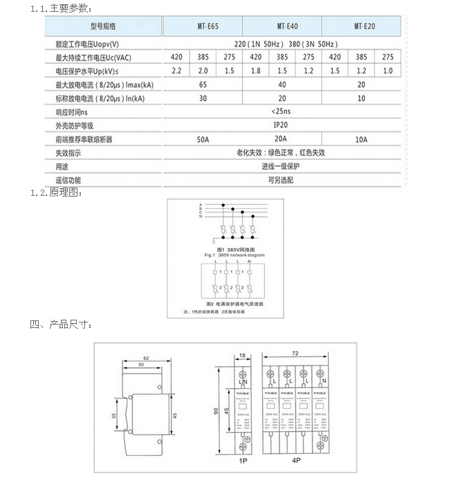 MT-E20电涌保护器(以下简称E20)适用于交流50/60Hz,额定电压380V的IT、TT、TN-C、TN-S、TN-C-S等供电系统,对间接雷电和直接雷电影响或其他瞬时过电压的电涌进行保护。依据IEC61643-1:1998-02标准。