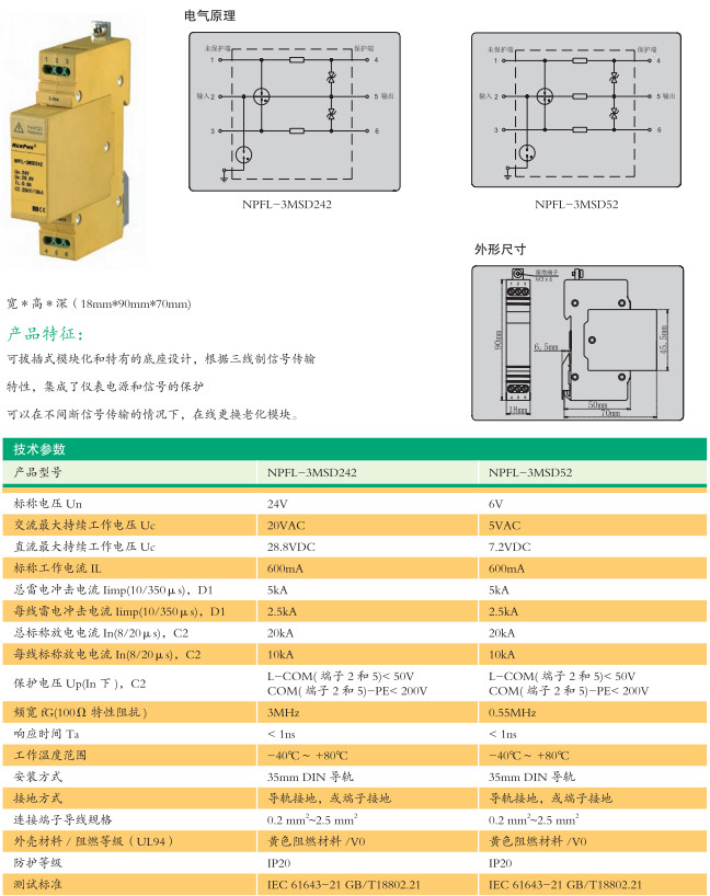 NPFL-3MSD52,NPFL-3MSD242,三线制通用型信号浪涌保护器(浮地)