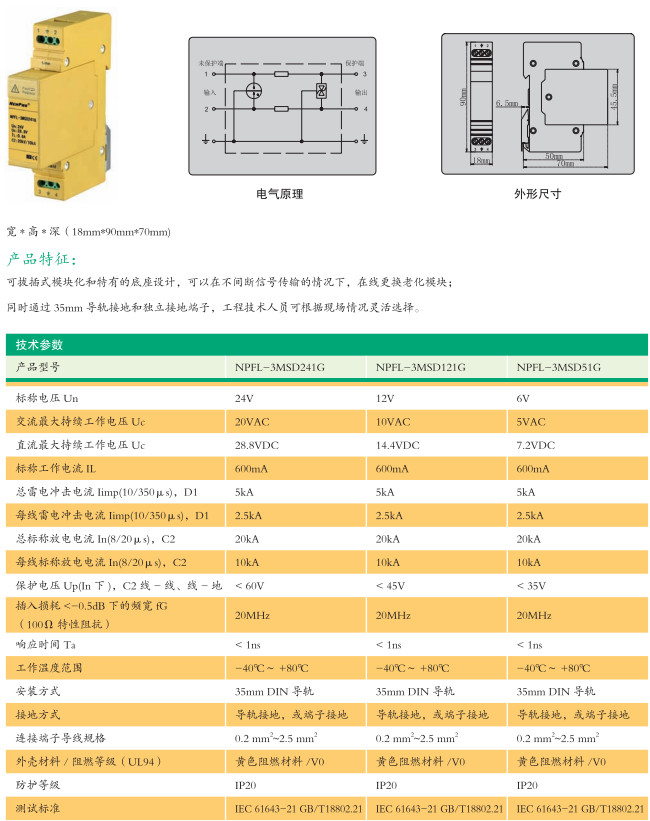 NPFL-3MSD51G,NPFL-3MSD241G,NPFL-3MSD121G,二线制接地型信号浪涌保护器