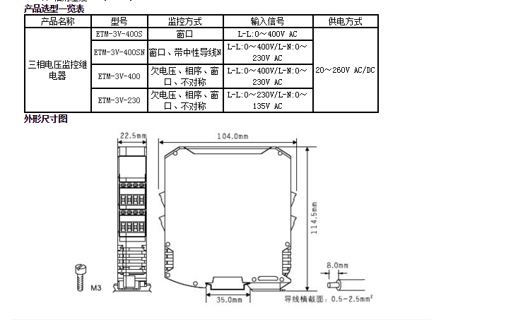 ETM-3V-230、ETM-3V-400、ETM-3V-400、ETM-3V-400三相电压监控,依据用户设定值实现对三相电的欠压、过压、不平衡度以及相序故障监控。该模块具有双刀双掷继电器输出。产品采用20~260V a.c./d.c.供电。电源、输入和输出三隔离。