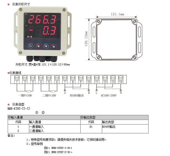 NHR-XTRT系列温度远传监测仪采用了表面贴装工艺,全自动贴片机生产,具有很强的抗干扰能力。本仪表支持两路PT100输入,实现对温度物理的测量显示,带RS485通讯输出功能,带双屏数码管显示,上窗口显示第1路测量值,下窗口显示第2路测量值。 |