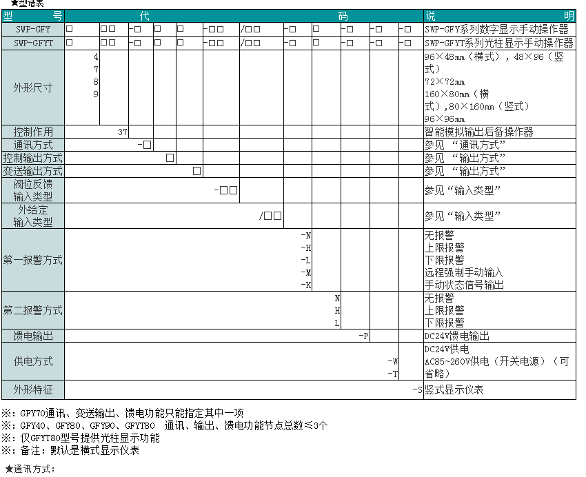 SWP-GFY系列数字/光柱显示智能模拟输出操作器接收从DCS系统或智能调节器来的0-10mA/4-20mA/0-5V/1-5V阀位给定输出信号,再由伺服放大器去驱动电动调节阀门或由电气转换器和阀门定位器去驱动气动薄膜阀,适合于作为DOS系统回路调节控制输出和智能调节器控制输出的后备操作器使用。