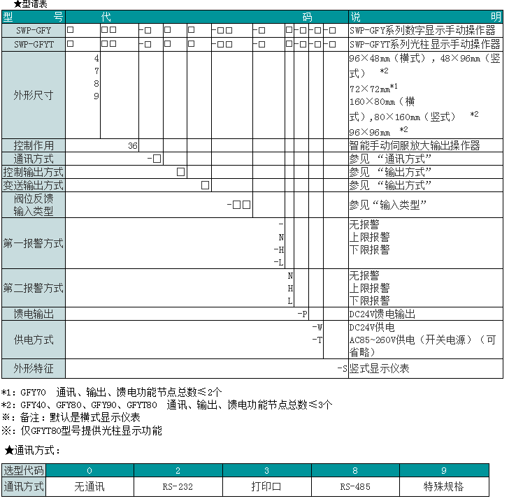 SWP-GFY系列数字/光柱显示手动伺服放大输出操作器,可通过按键操作直接输出正转和反转控制信号,驱动各种电动调节阀门,并带实际阀位数字显示,适合于各种电动调节阀门的手动操作与控制使用。