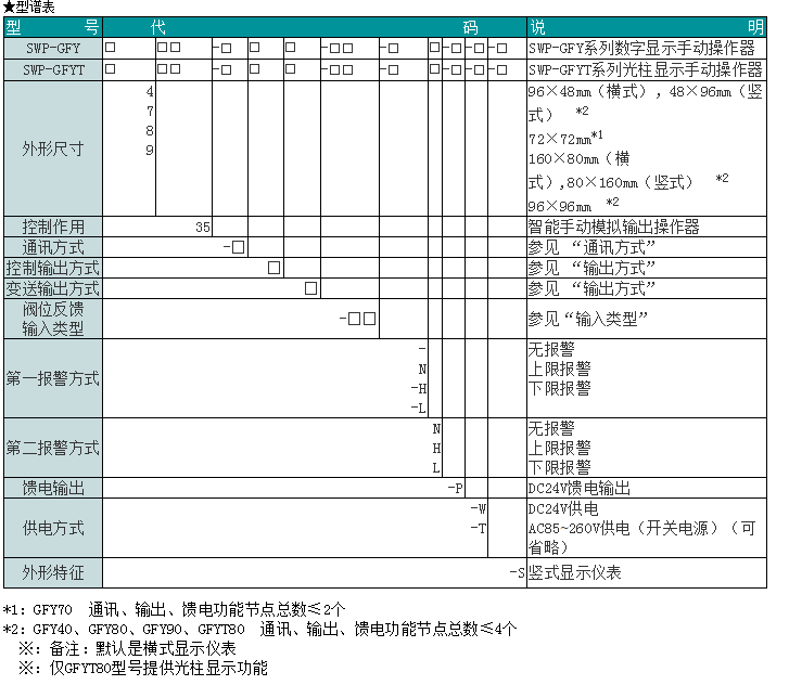 SWP-GFY系列数字/光柱显示手动模拟输出操作器可通过按键操作,直接输出0-10mA或4-20mA或0-5V或1-5V阀位给定信号,再由伺服放大器驱动电动调节阀门或由电气转换器和阀门定位器驱动气动薄膜阀,适用于各种阀门的手动给定控制。