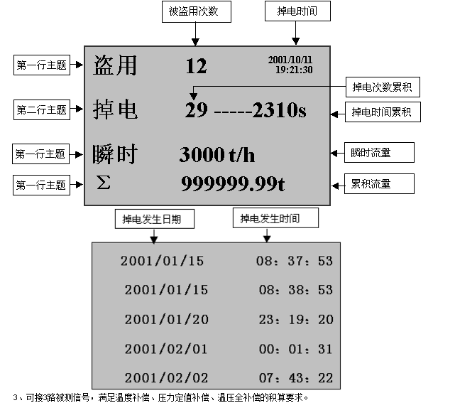 (1)可记录仪表工作期间发生掉电的时间、次数及掉电时间累积值,防止人为或意外掉电造成流量偏差