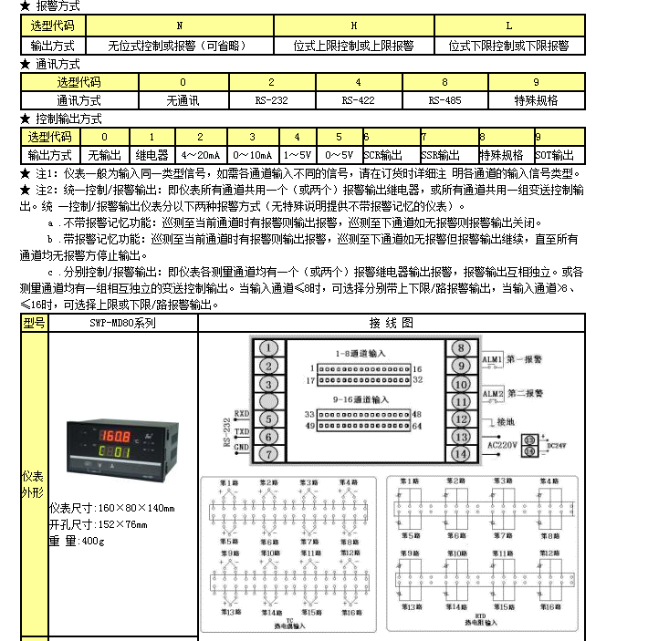可选择各输入通道统一报警控制输出(或统一变送输出)或各输入通道分别报警控制输出(或分别变送输出)。各通 道统一报警控制输出可选择报警带记忆(任一通道报警未解除将一直报警直至所有通道均无报警)或报警无记忆(巡回至有报警通道时输出报警,巡回至无报警的通道时则不报警)。
