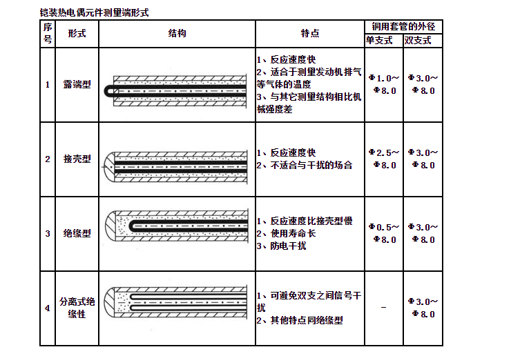 6、铠装热电偶外径尺寸范围:铠装热电偶外径可提供Φ0.25~8Φmm,特殊要求的可以提供Φ12mm的产品