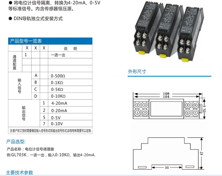 GL703K信号隔离调理器输出范围:0-20mA、4-20mA、0-5V、0-10V等用户需要的标准信号