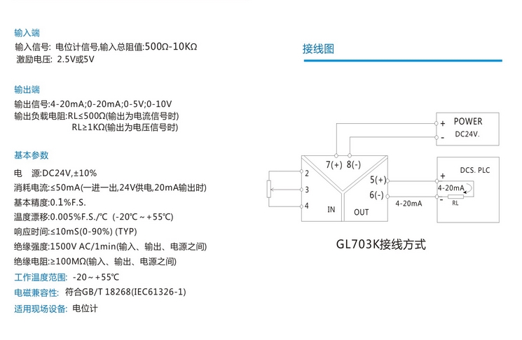 GL703K信号隔离调理器辅助电源:DC24V,精度0.2级 全隔离