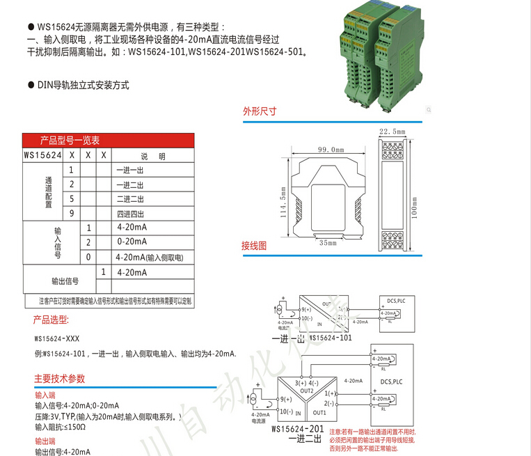 WS15624四输出全隔离信号隔离器,将输入的四路信号隔离输出,无需外接电源可正常工作,输入输出隔离,传输精度高,标准DIN T型导轨安装