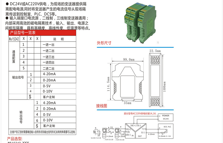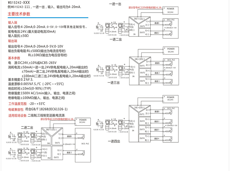 输入输出方式:一入一出、一入二出、一入三出、一入四出、二入二出输入范围:0-10V、4-20mA、0-20mA、0-5V、0-75mV等用户特定规格