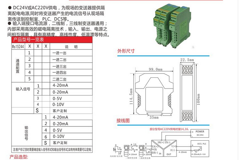 信号隔离器 隔离栅辅助电源:DC24V 或AC220V, 高精度:0.1%