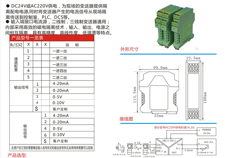 WS15242全隔离双输出信号分配器 隔离栅,信号隔离器模块,安全栅,电流转换模块。将输入信号变换为两路相互隔离的信号,低功耗,低热量,低漂移,DIN T型导轨安装