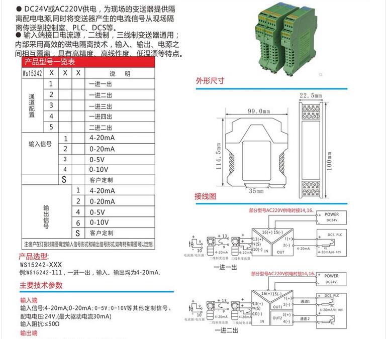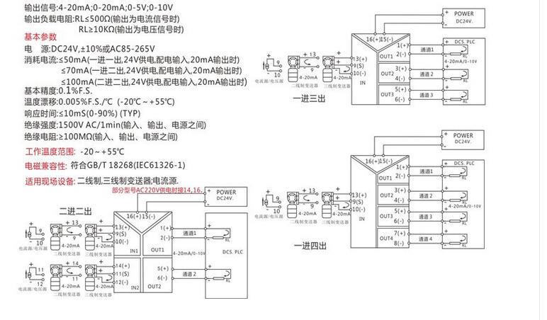 信号隔离器分配器电源:DC24V AC220V电源可选 精度:0.1级%