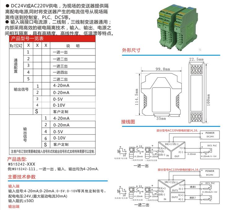 WS15242全隔离输出信号分配器 安全隔离栅,信号隔离器模块,安全栅,电流转换模块。将输入信号变换为两路相互隔离的信号,低功耗,低热量,低漂移,DIN T型导轨安装
