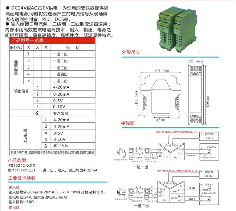 WS15242全隔离输出信号分配器,配电器,安全隔离栅,信号隔离器模块,安全栅,电流转换模块。将输入信号变换为两路相互隔离的信号,低功耗,低漂移,DIN T型导轨安装,默认DC24V电源,AC220V.