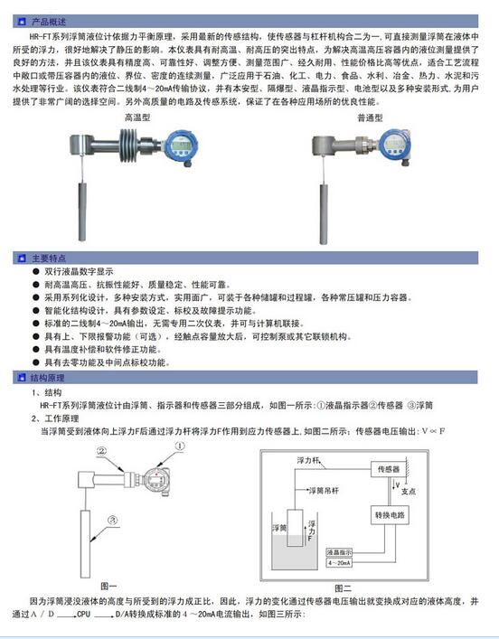 HR-FT系列浮筒液位计依据力平衡原理,采用最新的传感结构,使传感器与杠杆机构合二为一,可直接测量浮筒在液体中所受的浮力,很好地解决了静压的影响。本仪表具有耐高温、耐高压的突出特点,为解决高温高压容器内的液位测量提供了良好的方法,并且该仪表具有精度高、可靠性好、调整方便、测量范围广、经久耐用、性能价格比高等优点