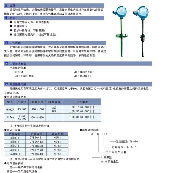通常和显示仪表、记录仪表等配套使用。直接测量生产现场存在碳氢化合物等爆炸的0~500℃范围内液体、蒸汽和气体