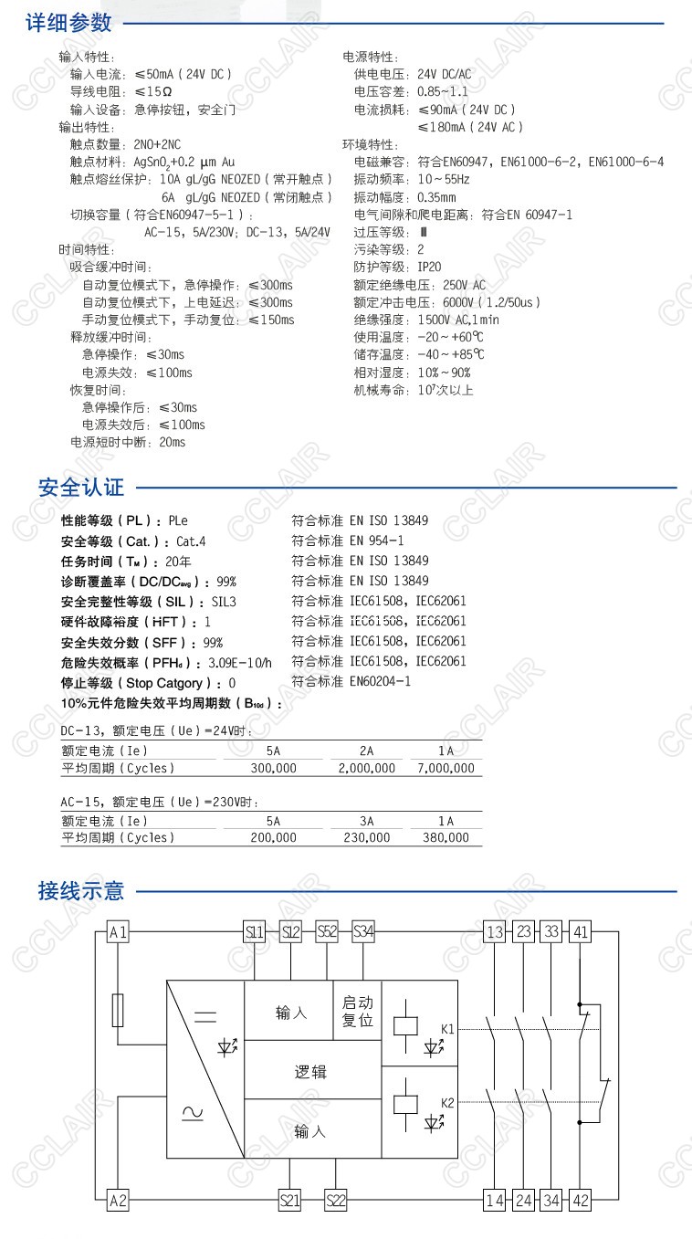 CZSR8001-2A2B是适用于急停按钮、安全门控开关输入,具有2路NO(常开)安全输出触点和2路NC(常闭)辅助输出触点的安全继电器。它可选择单双通道操作,手动或自动复位,并具有通道间短路监控功能。