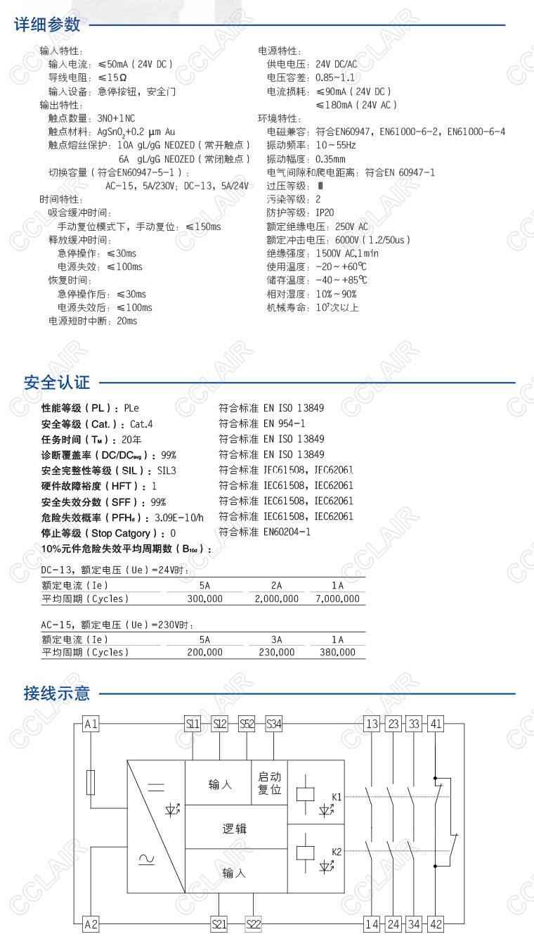CZSR8001-3A1B(M)是适用于急停按钮、安全门控开关输入,具有3路NO(常开)安全输出触点和1路NC(常闭)辅助输出触点的安全继电器。它可选择单、双通道操作,手动复位,并具有通道间短路监控,复位按钮监控功能。