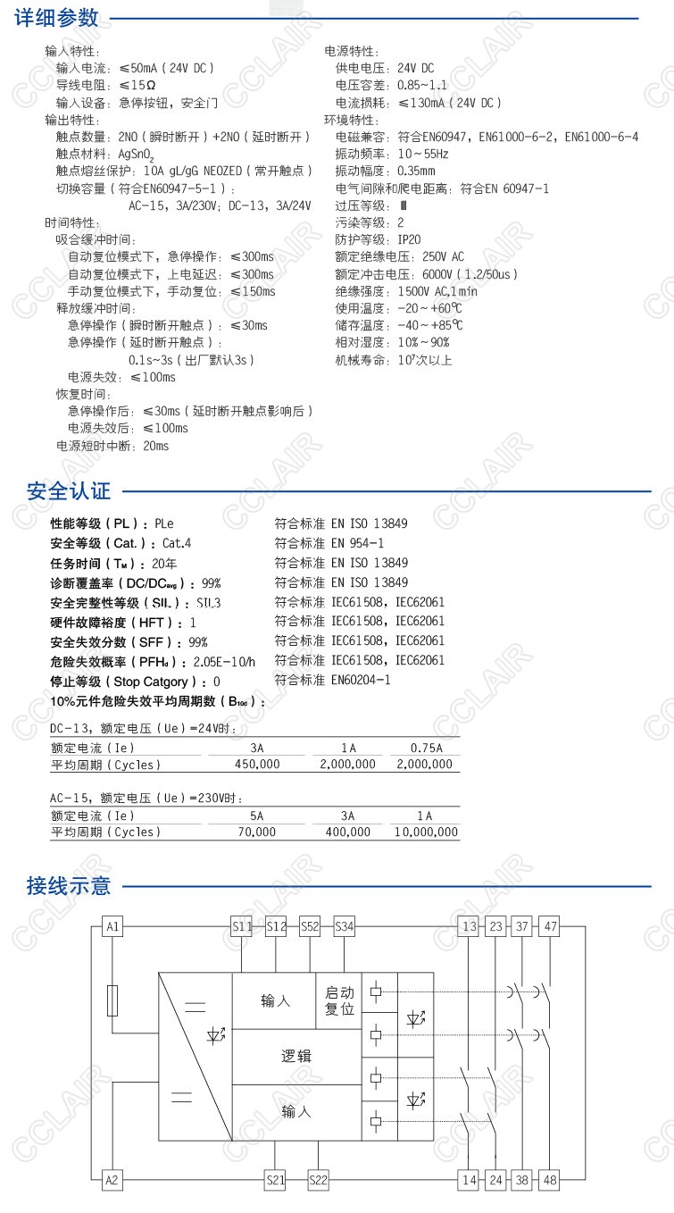 CZSR8002-2A2AT是适用于急停按钮、安全门控开关输入,具有2路NO(常开)安全输出触点(瞬时断开)和2路NO(常开)辅助输出触点(延时断开)的安全继电器。它可选择单、双通道操作,手动或自动复位,并具有通道间短路监控功能。