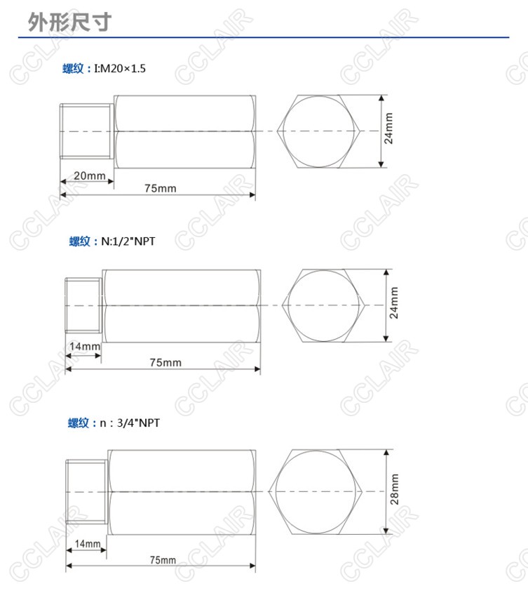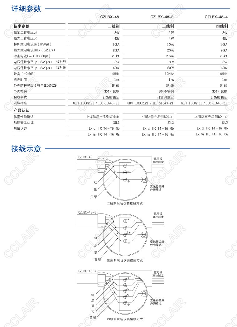 现场安装型SPD,三线制,螺纹制式(订货时指定):M20×1.5、1/2″NPT、3/4″NPT,适合变送器、热电阻、热电偶、RS-485、RS-232、RS-422、流量计、电磁阀等现场设备的保护,隔爆、本安防爆双认证。