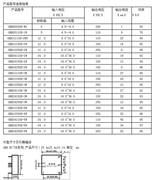 GRB 0.2~5W 系列模块电源是一种DC-DC升压变换器。该模块电源的输入电压分为:4.5~9V、9~18V、及18~36VDC标准(2:1)宽输入电压范围(宽电压输入模块电源是指输入电压可以允许在很宽的范围内变化)。输出单电压:100VDC、110VDC、150VDC、200VDC、250VDC等,具有功率密度大,输出功率高,应用范围广等优点。