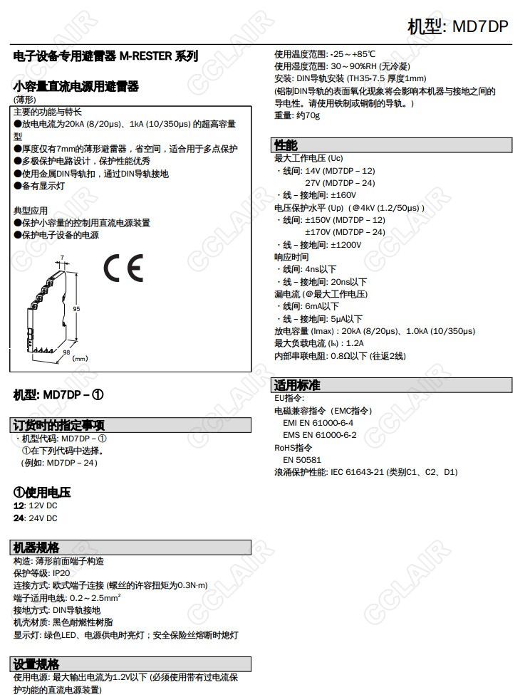 MD7DP-12/MD7DP-24,直流电源用 最大负载1.2A 超薄型避雷器