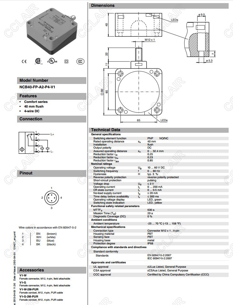 NCB40-FP-A2-P4-V1,电感式接近开关