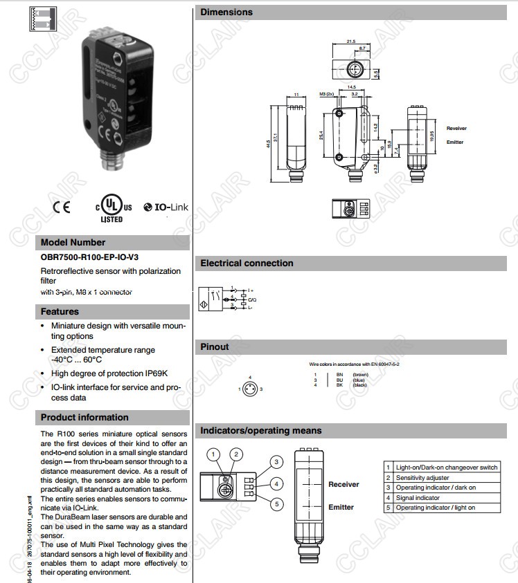 OBR7500-R100-EP-IO-V3,反射板型传感器
