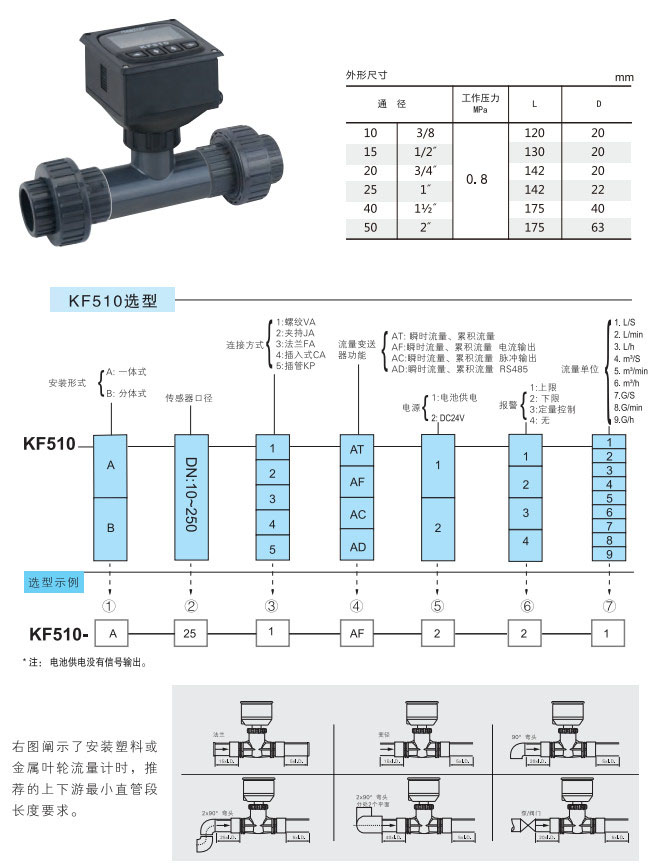 KF510-A-10,KF510-A-15,KF510-A-20,KF510-A-25,KF510-A-40,KF510-A-50,KP插管连接叶轮流量计