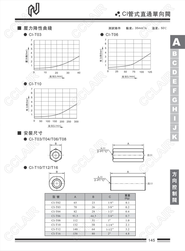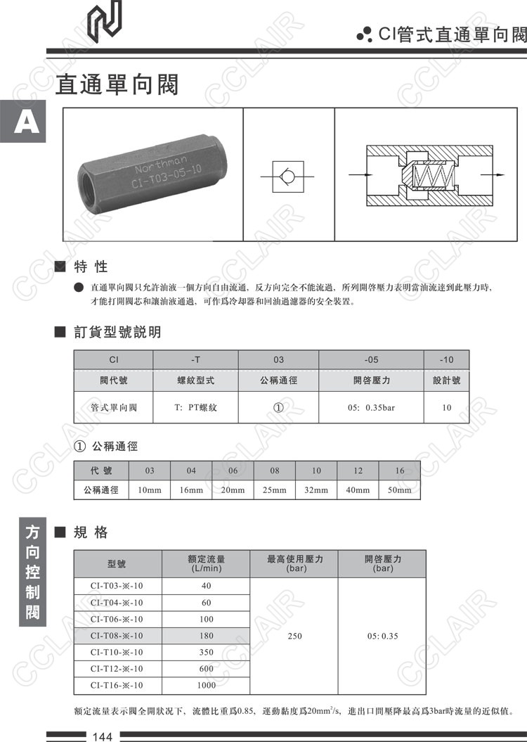 Northman台湾北部精机,管式直通单向阀CI-T03-05-10,CI-T04-05-10,CI-T06-05-10,CI-T08-05-10,CI-T10-05-10,CI-T12-05-10,CI-T16-05-10