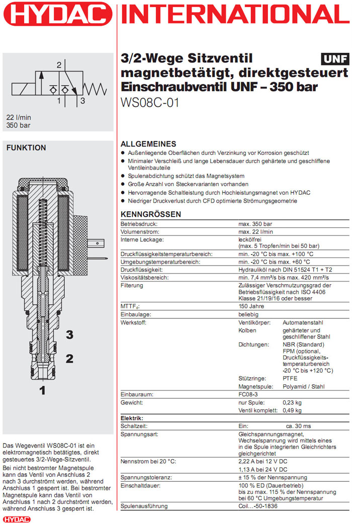 WS08C-01-C-N-12DG,WS08C-01-C-N-24DG,HYDAC二位三通方向提升阀