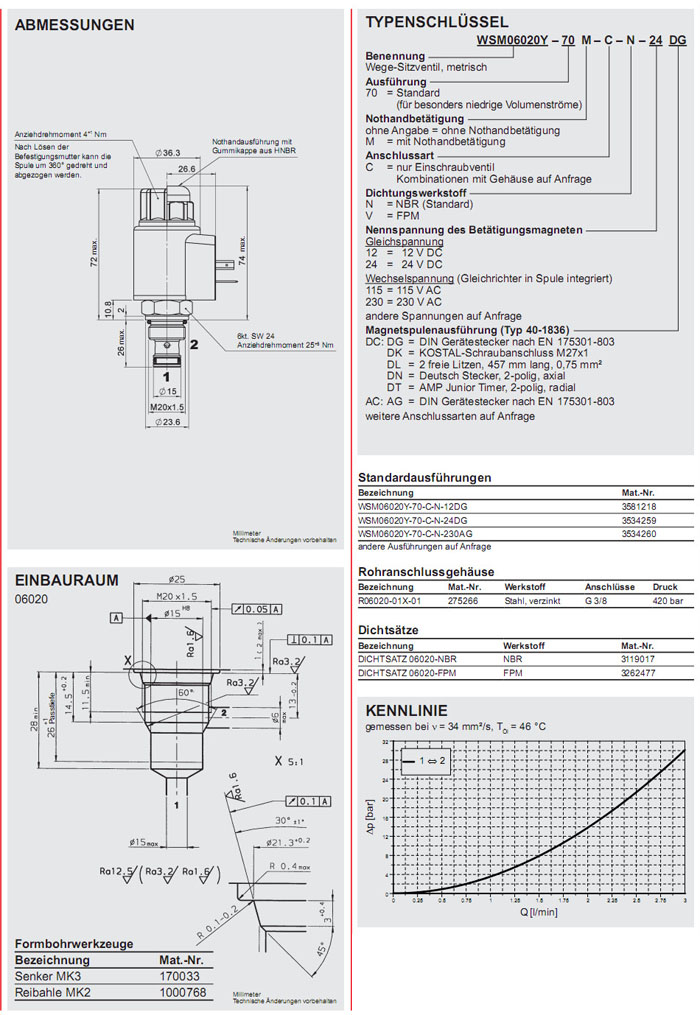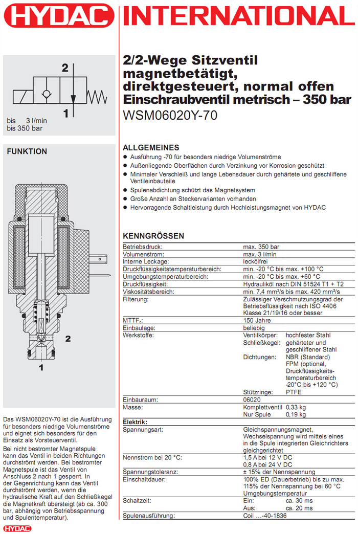 WSM06020Y-70-C-N-12DG,WSM06020Y-70-C-N-24DG,WSM06020Y-70-C-N-230AG,HYDAC电磁2/2方向座阀