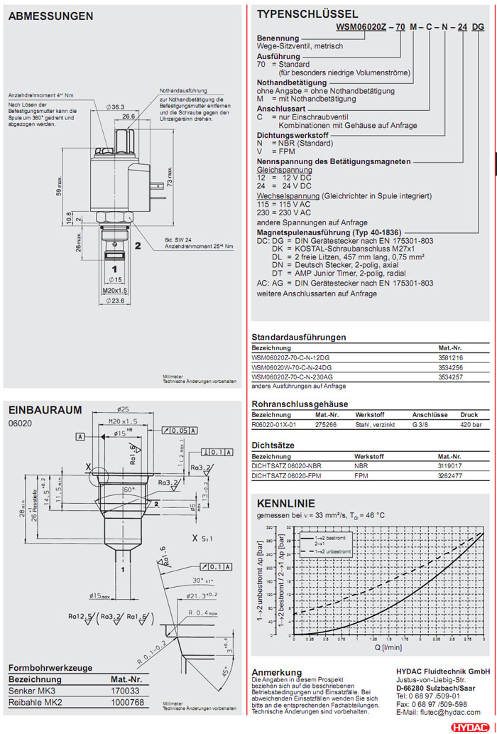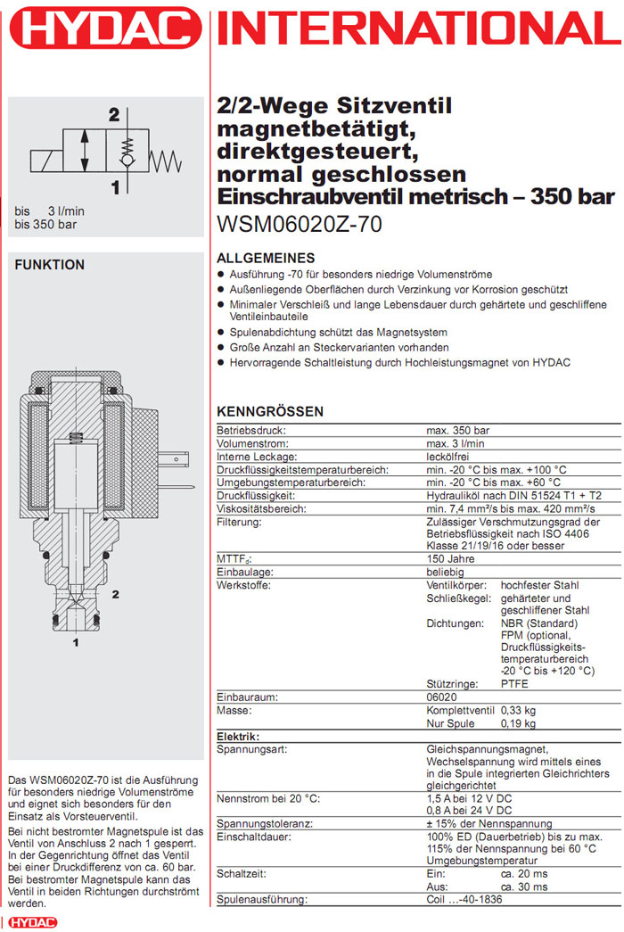 WSM06020Z-70-C-N-12DG,WSM06020W-70-C-N-24DG,WSM06020Z-70-C-N-230AG,HYDAC电磁2/2方向座阀