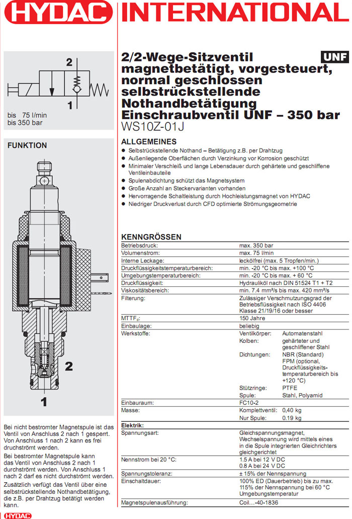 WS10Z-01J-C-N-24DG,WS10Z-01J-C-N-12DG,HYDAC电磁2/2方向座阀