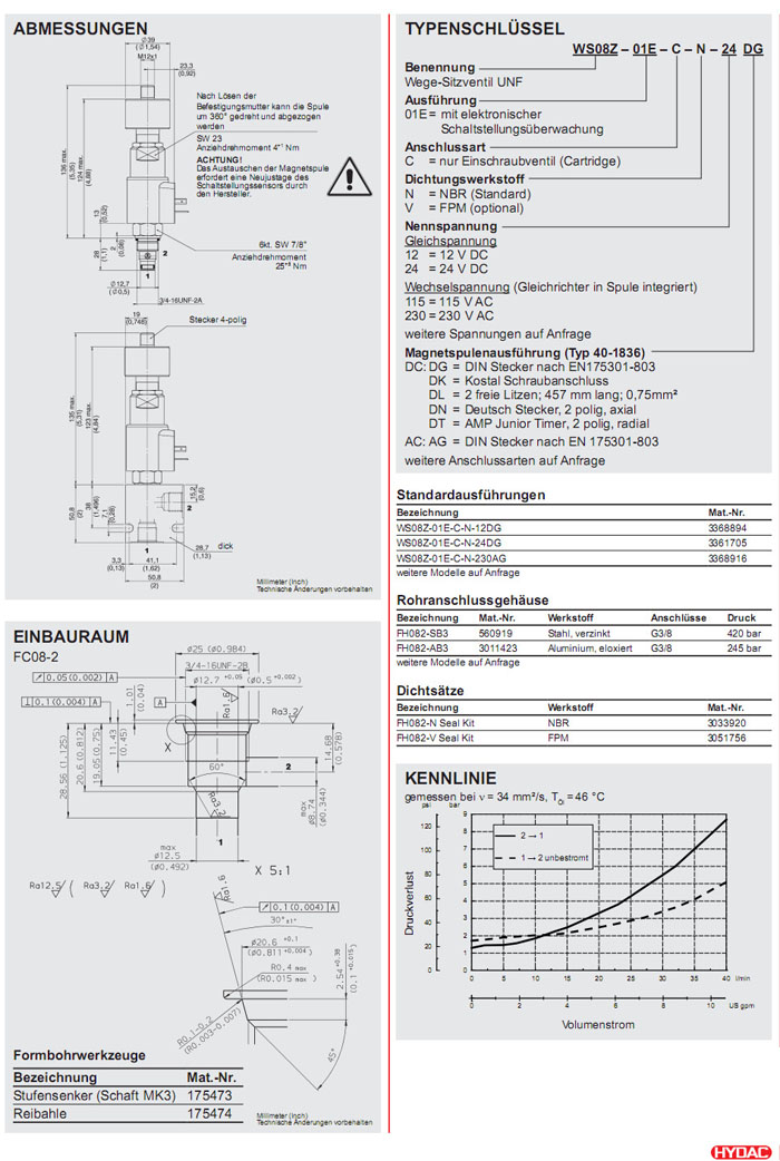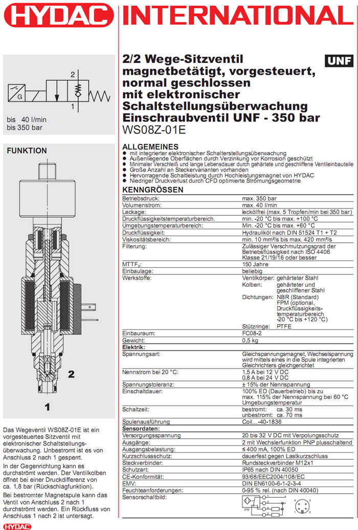 WS08Z-01E-C-N-12DG,WS08Z-01E-C-N-24DG,WS08Z-01E-C-N-230AG,HYDAC电磁2/2方向座阀