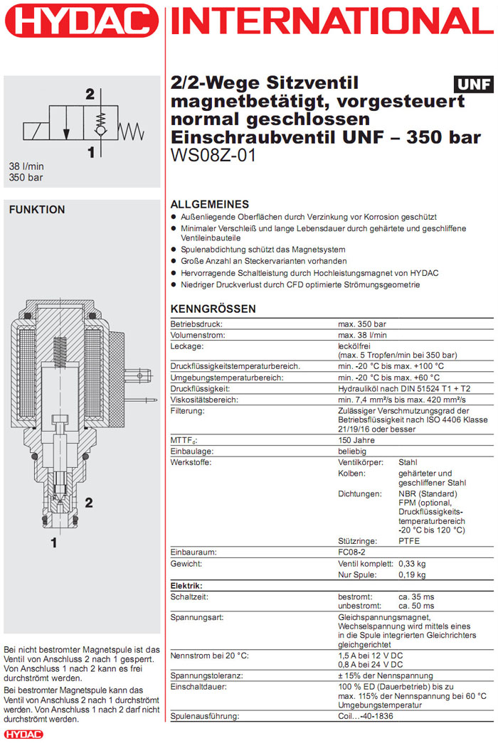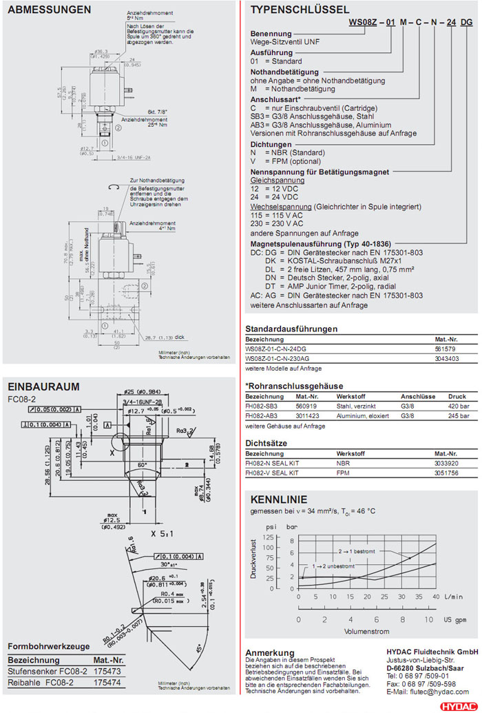 WS08Z-01-C-N-24DG,WS08Z-01-C-N-230AG,HYDAC电磁2/2方向座阀