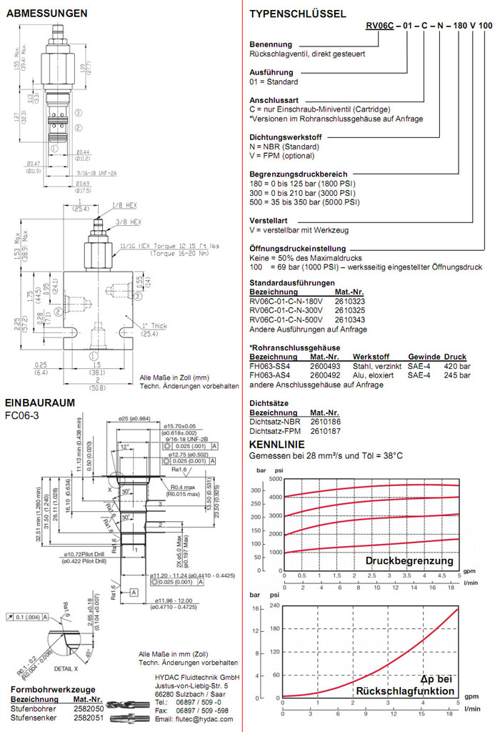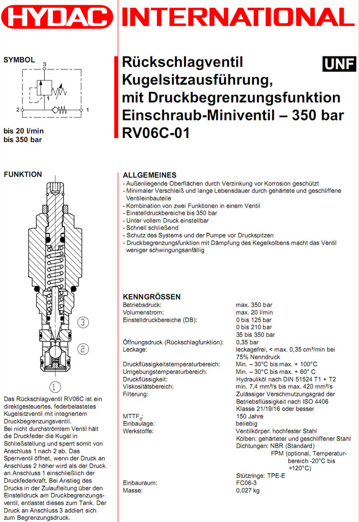 RV06C-01-C-N-180V,RV06C-01-C-N-300V,RV06C-01-C-N-500V,HYDAC止回阀