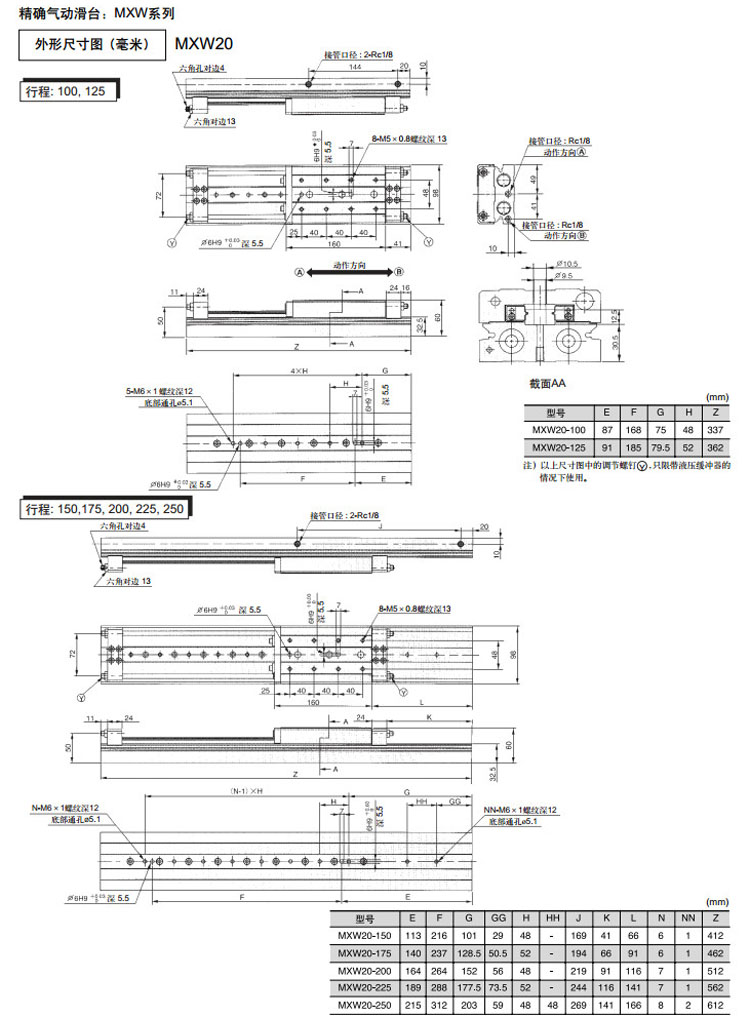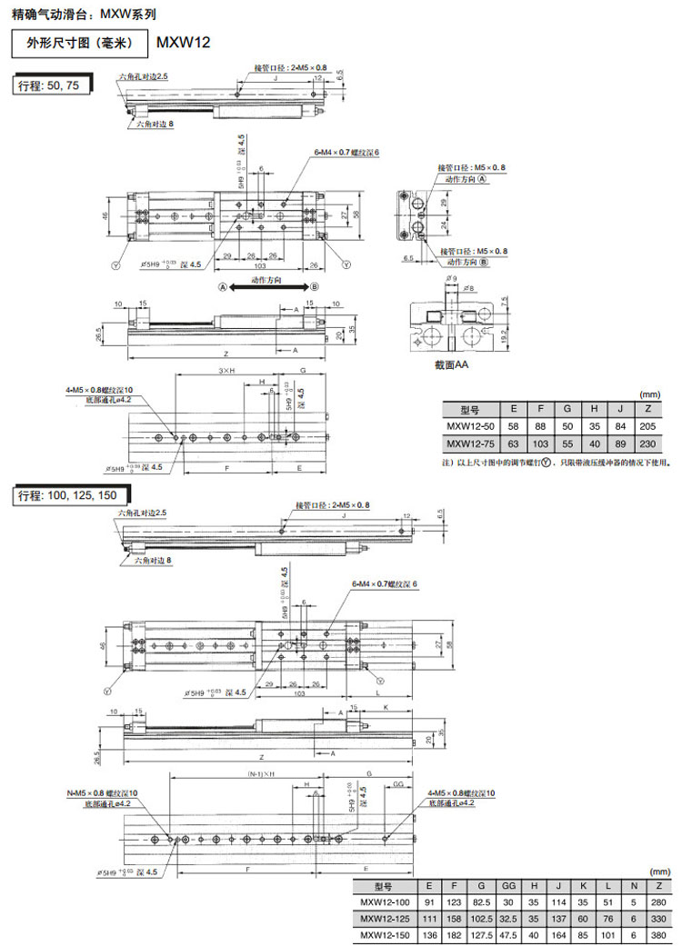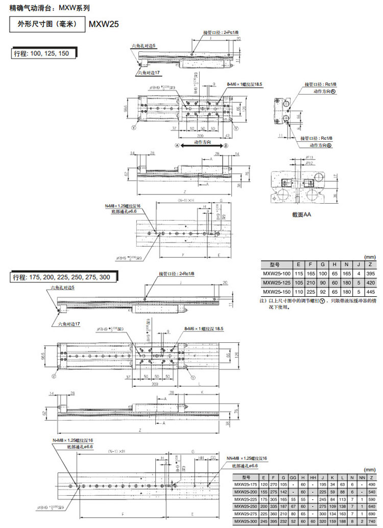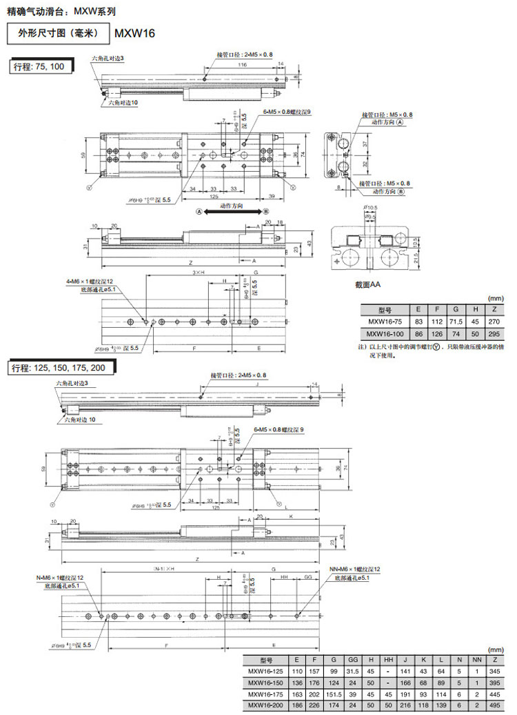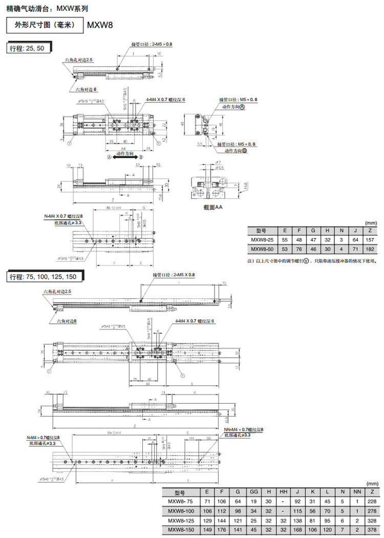 MXW8-25,MXW12-50,MXW16-75,MXW20-100,MXW25-100,MXW8-50,MXW12-75,MXW16-100,SMC气动滑台气缸