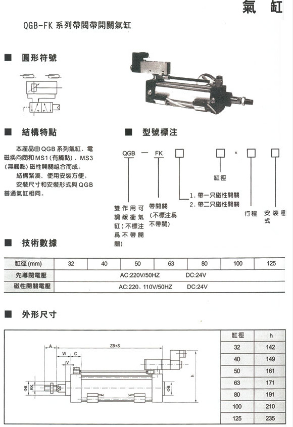 QGB-FK1-32,QGB-FK1-40,QGB-FK1-50,QGB-FK1-63,QGB-FK1-80,带阀带开关气缸